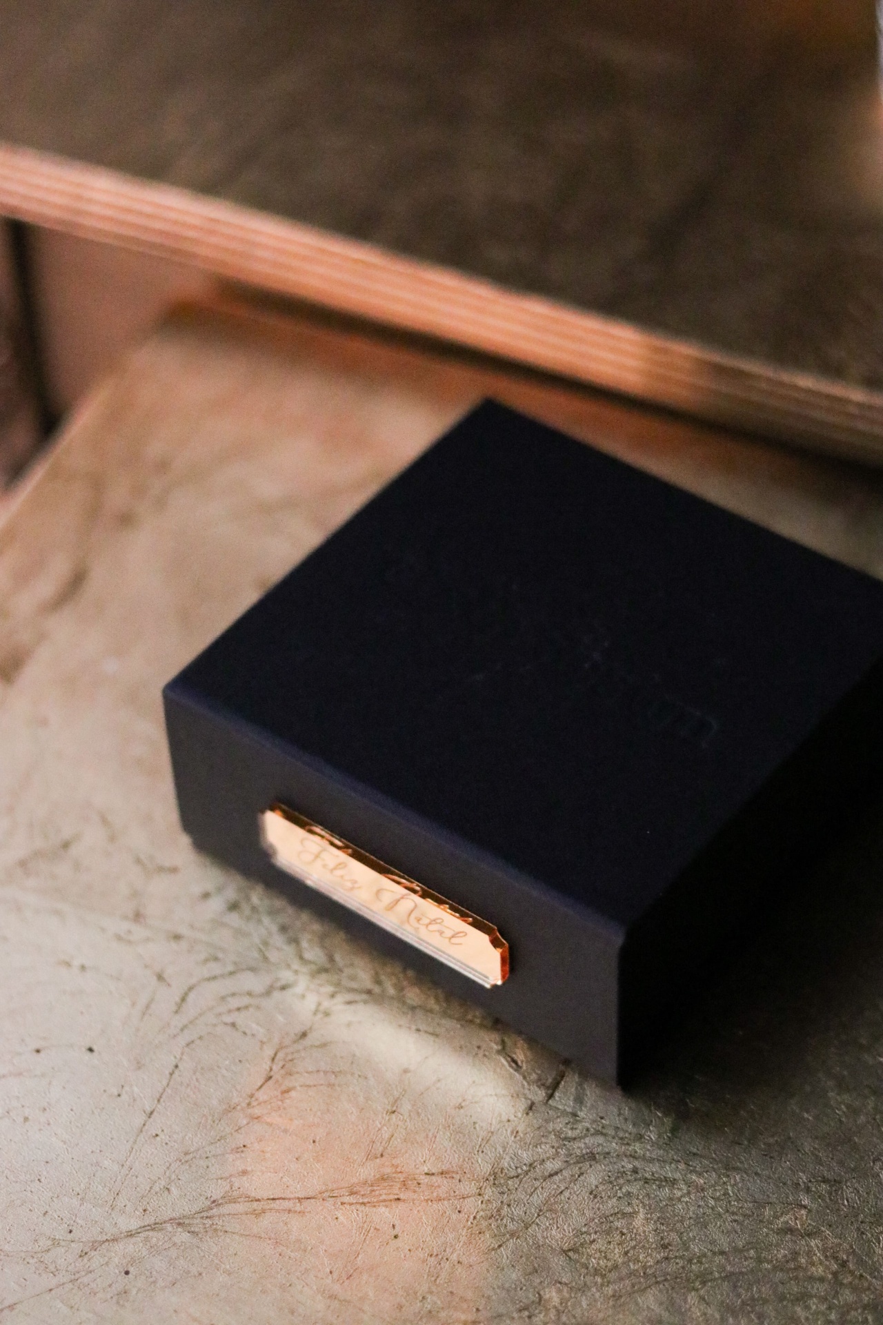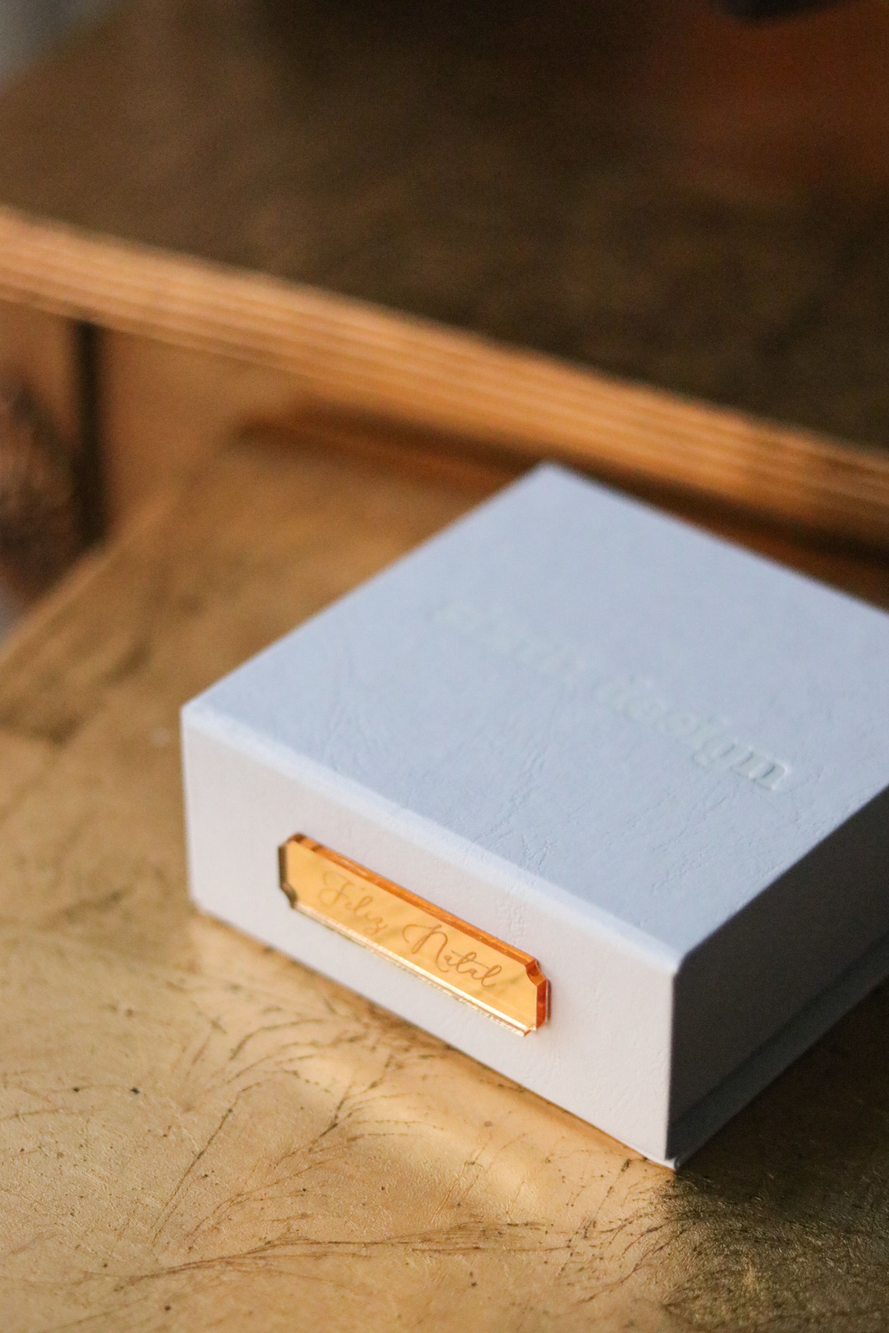 Inclui cordão em seda cor dourada e caixa rígida em cartão texturizado com placa acrílico dourado Feliz Natal — possibilidade de personalizar com o nome/palavra que desejar.