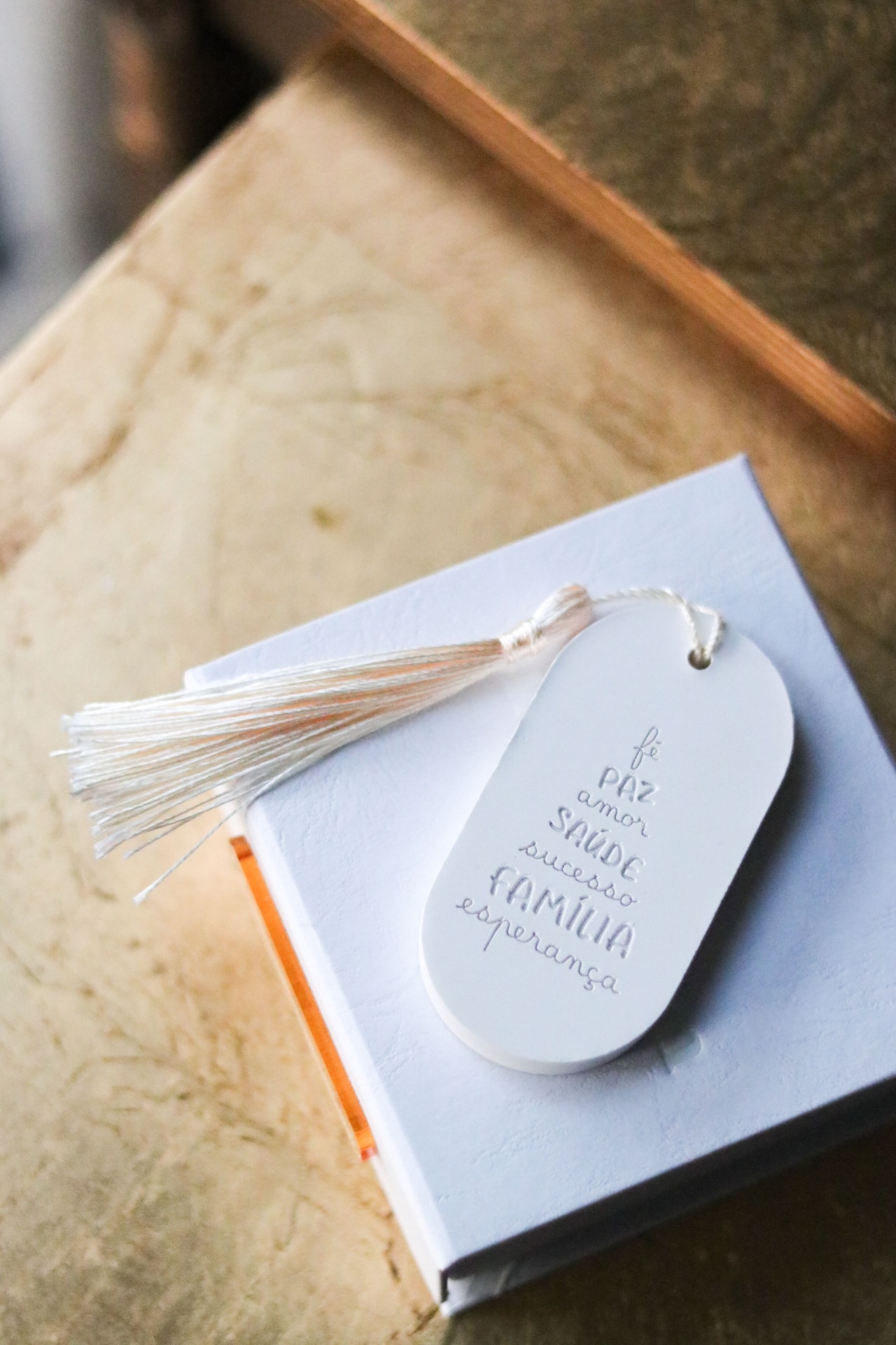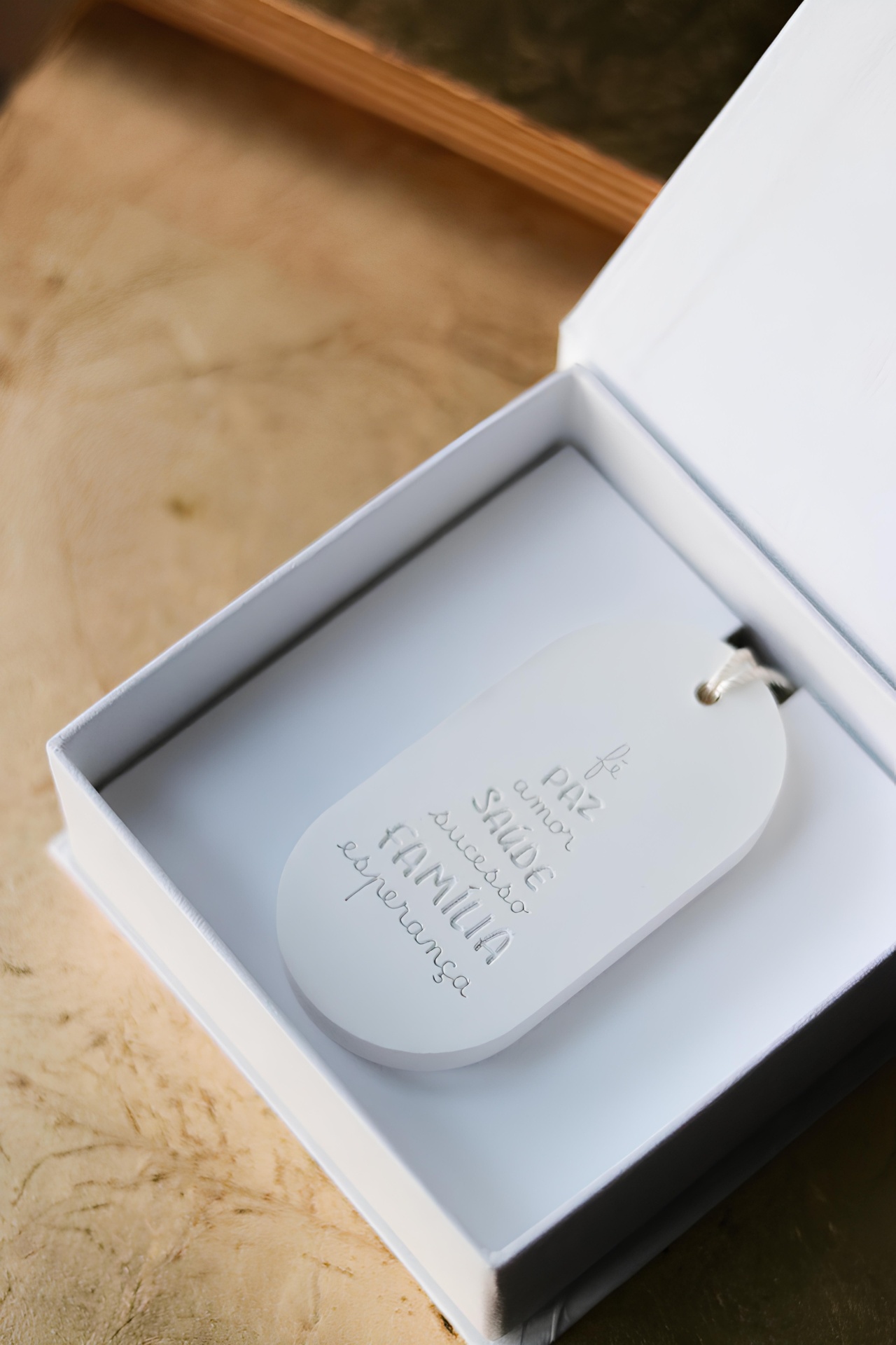 Peça em gesso perfumado gravada com palavras que simbolizam o Natal.