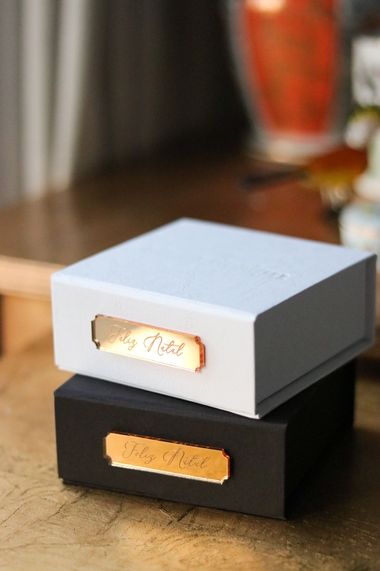 Inclui cordão em seda cor bege e caixa rígida em cartão texturizado com placa acrílico dourado Feliz Natal — possibilidade de personalizar com o nome/palavra que desejar.