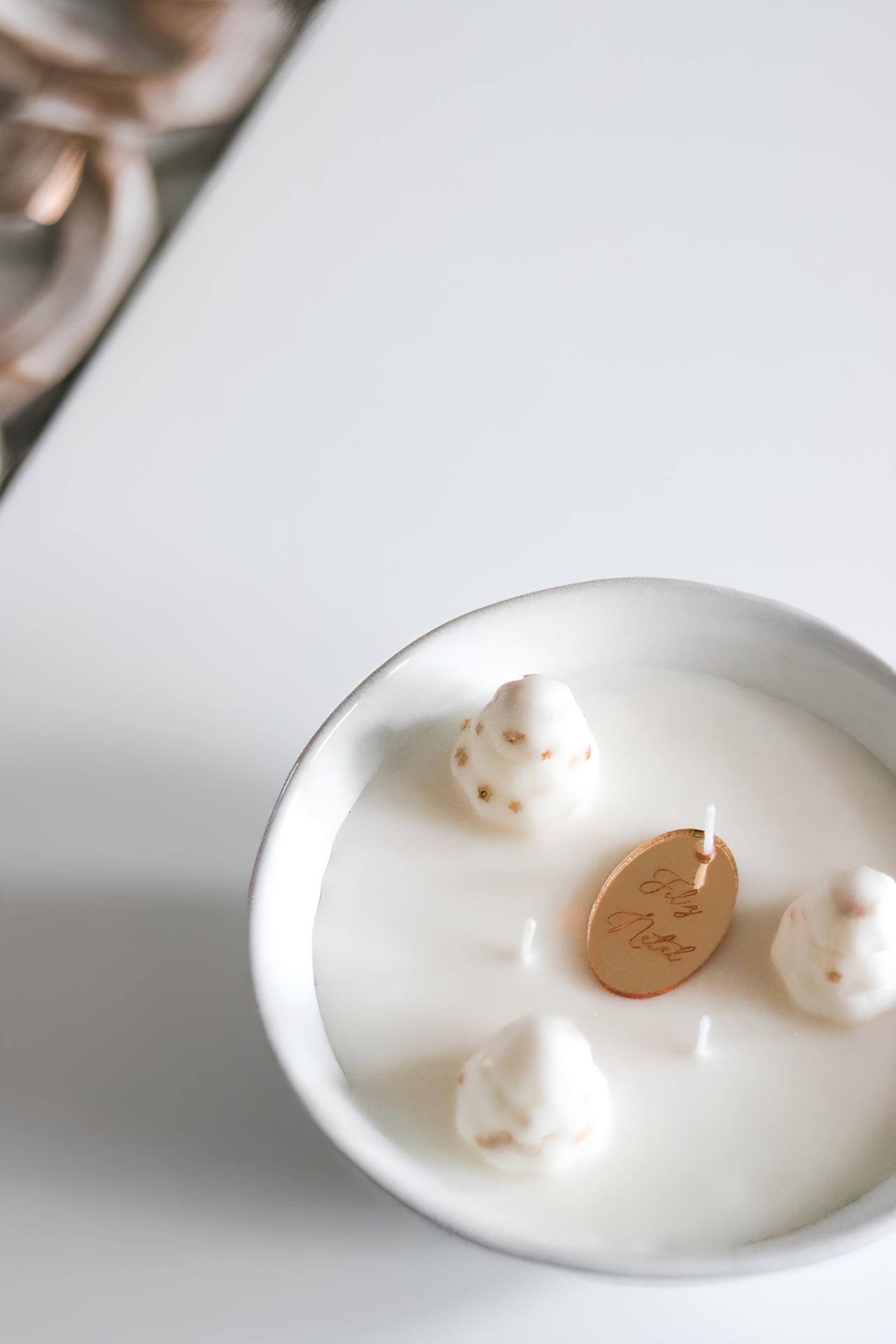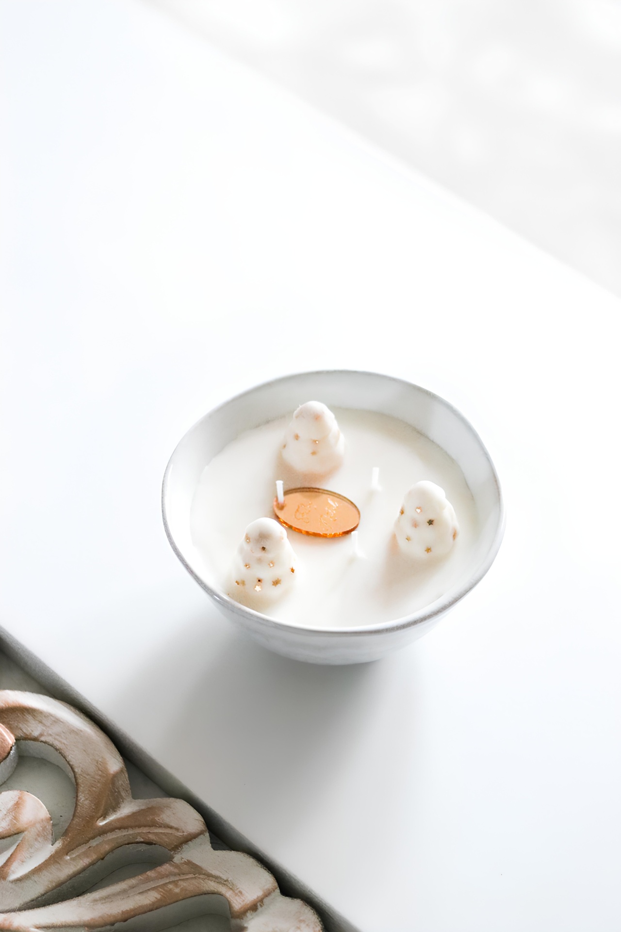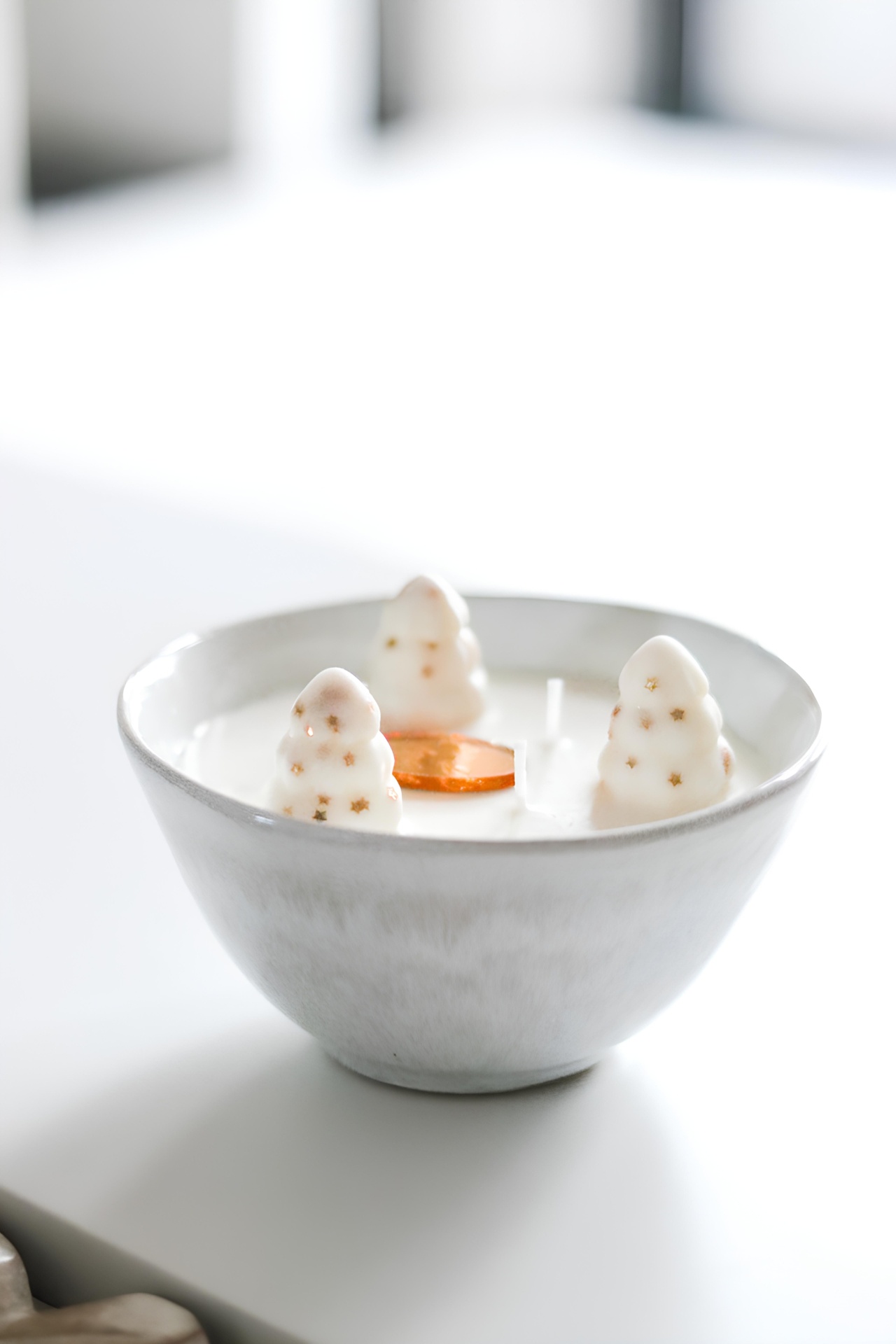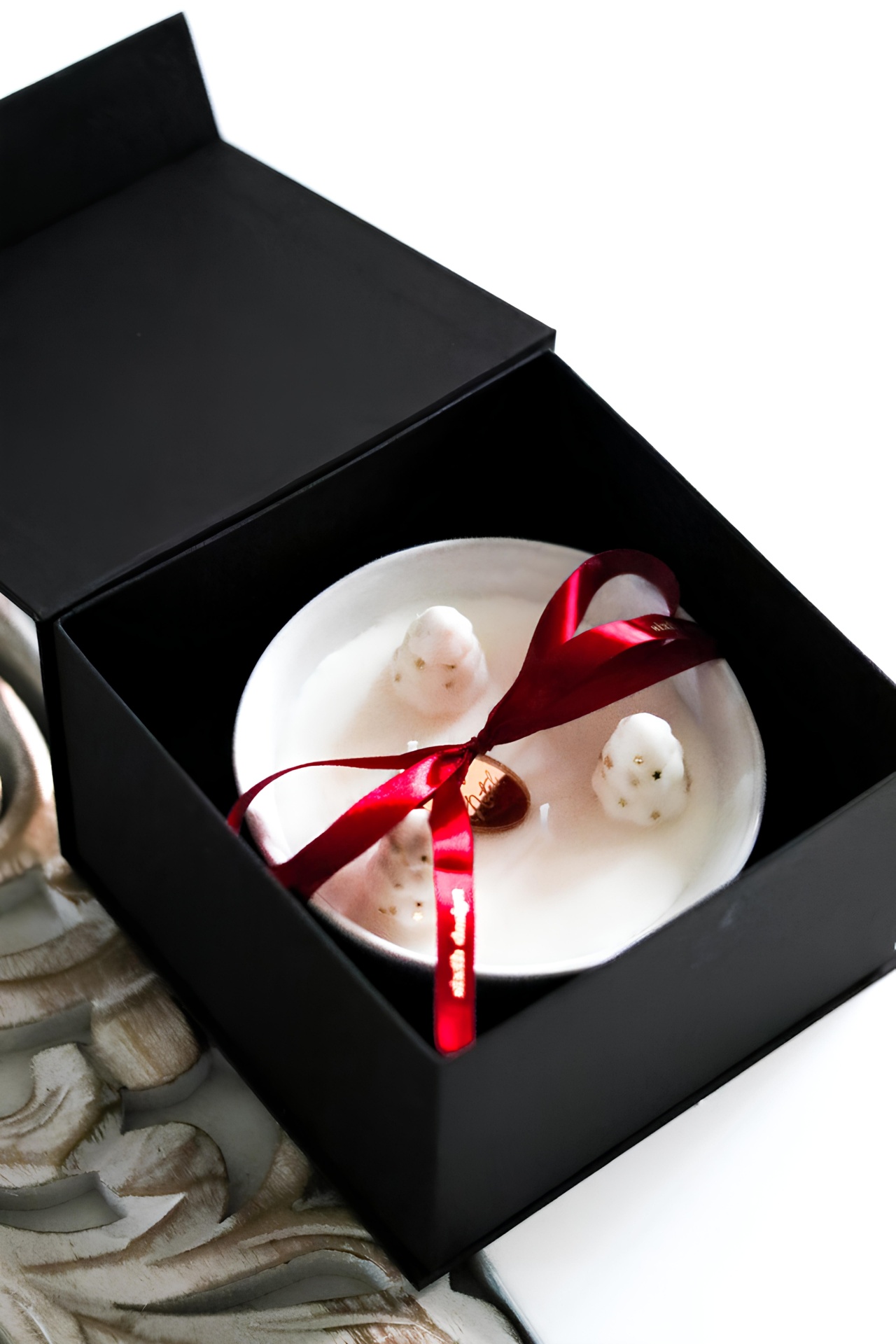 Vela artesanal premium, com árvores de natal e delicados toques dourados que refletem o encanto das noites de inverno.
