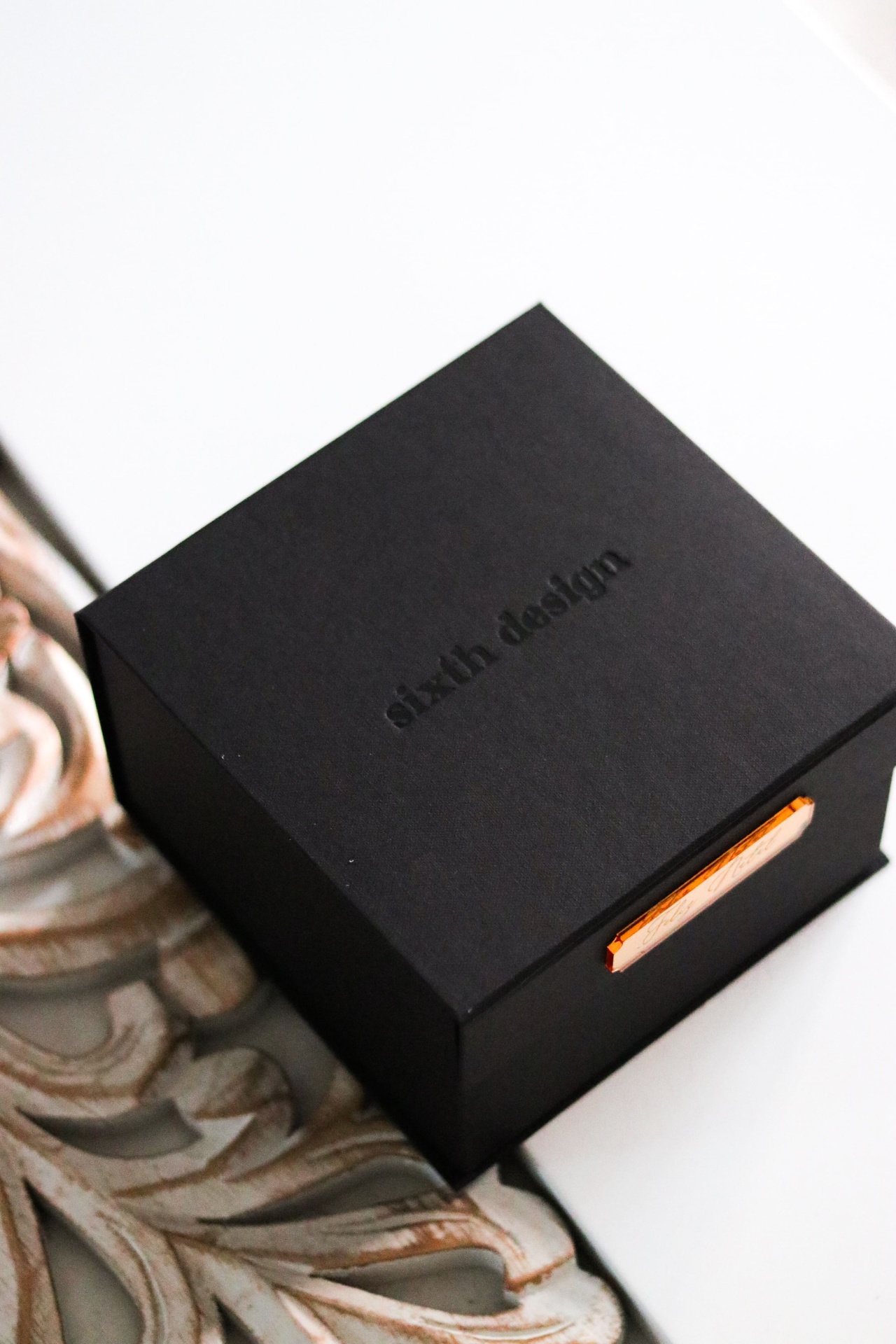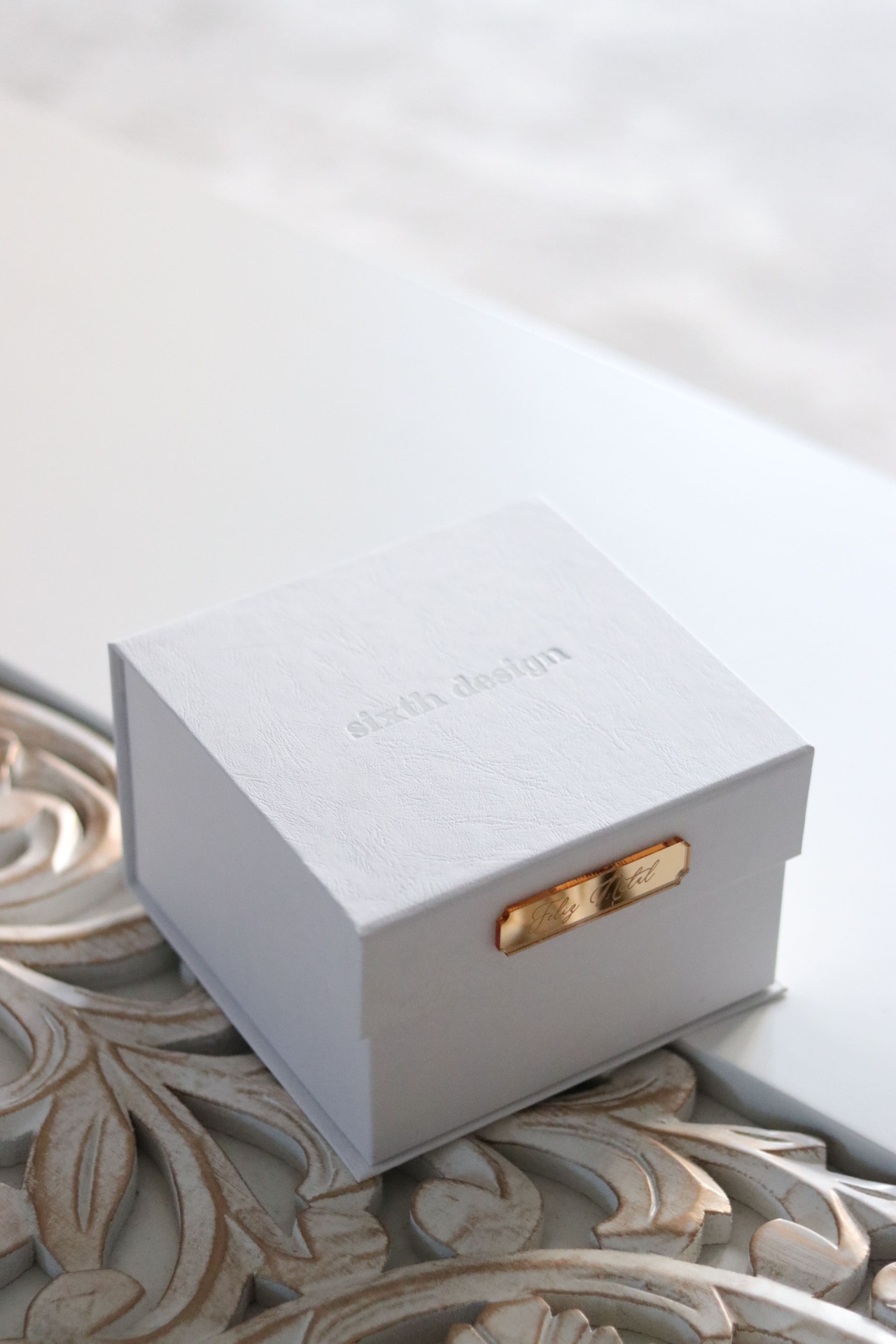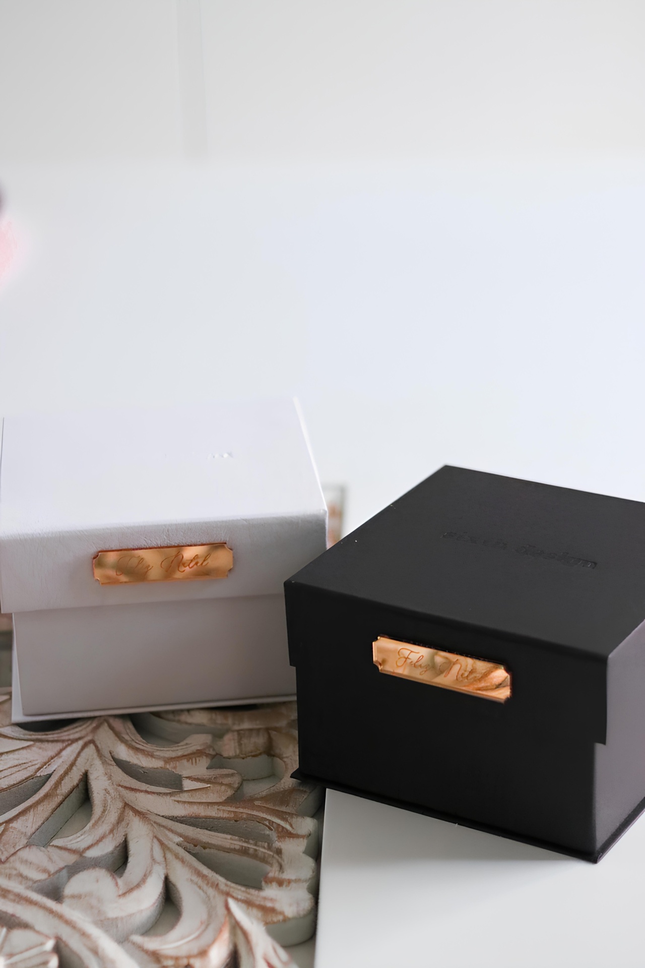 Acompanha caixa rígida em cartão texturizado com placa acrílico dourado Feliz Natal — possibilidade de personalizar com o nome/palavra que desejar, tal como na medalha em acrílico na vela.